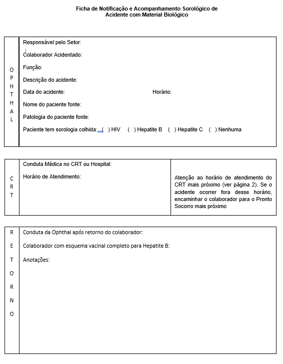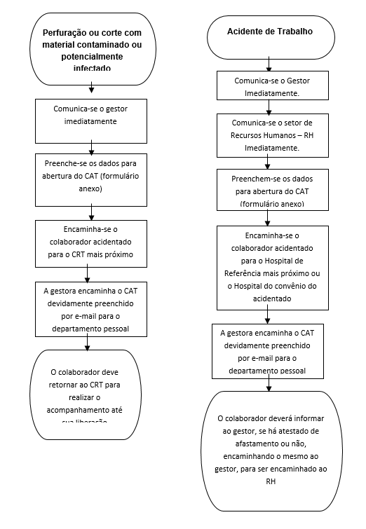 Em casos de acidente com perfuro-cortantes, comunica-se imediatamente à gestora da unidade. Em seguida, preenche-se o formulário anexo (dados para abertura do CAT) e encaminha-se o colaborador para o CRT mais próxima da unidade:
