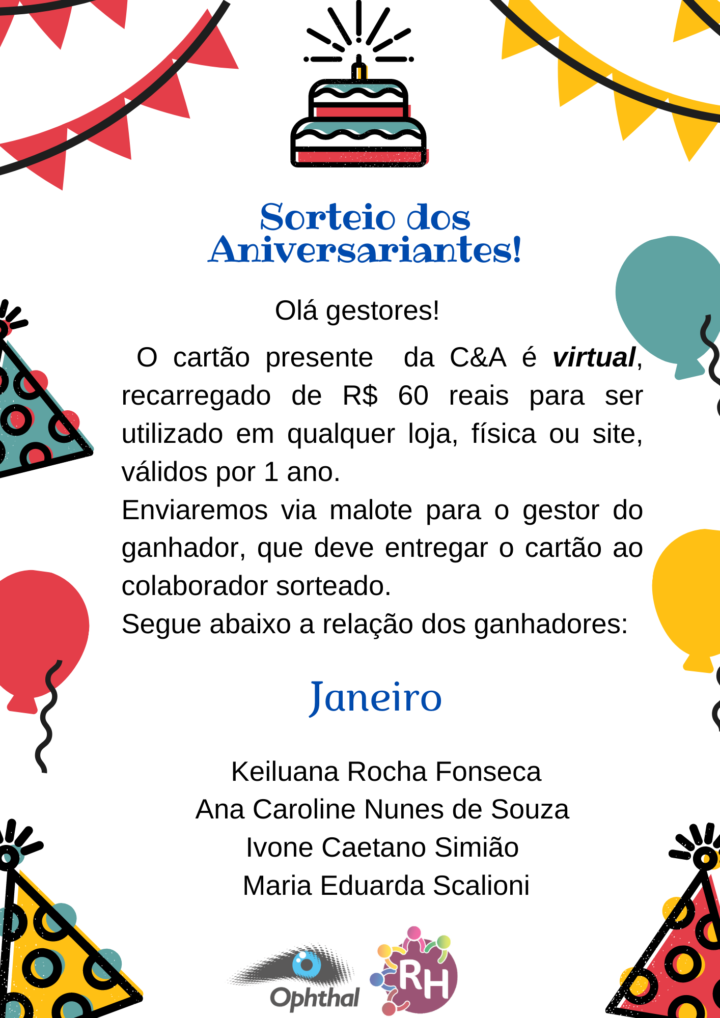 ANIVERSARIANTES SORTEADOS DO MÊS DE JANEIRO!!!