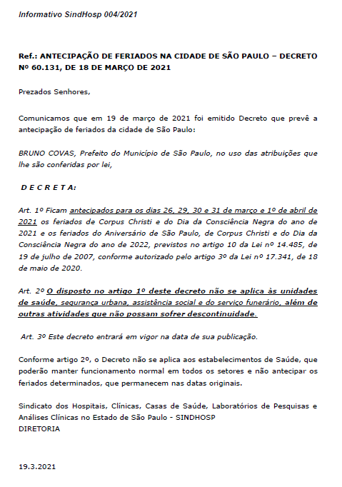 ANTECIPAÇÃO DOS FERIADOS – DECRETO Nº 60.131, DE 18 DE MARÇO DE 2021