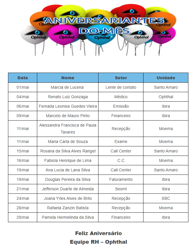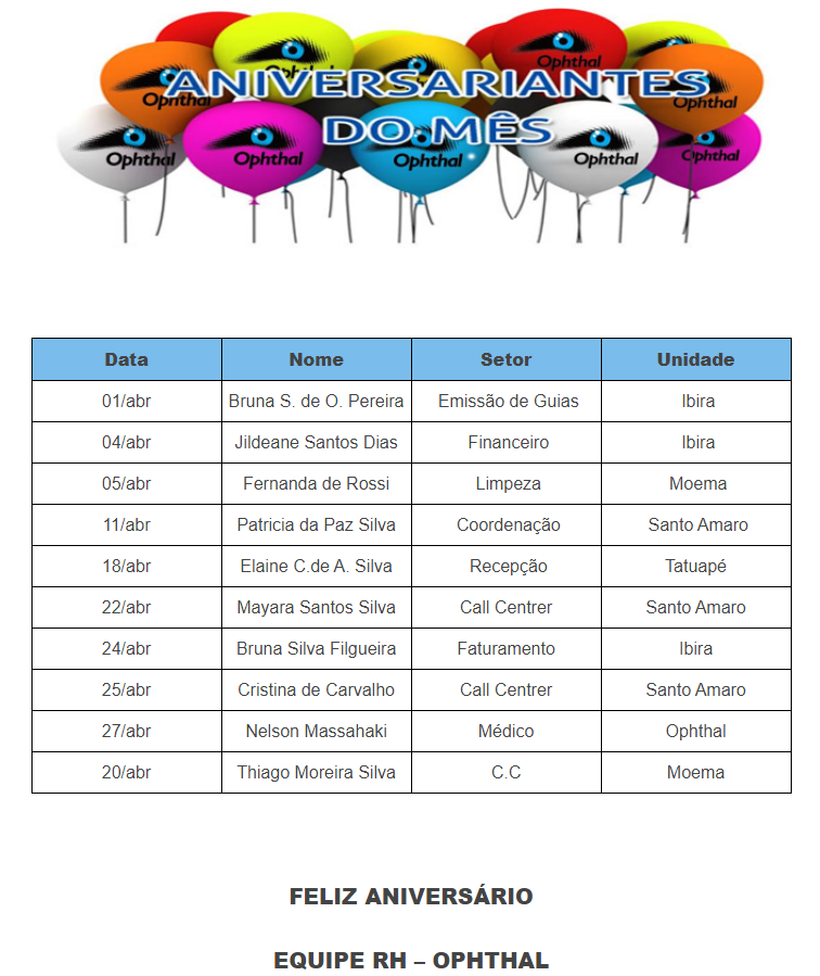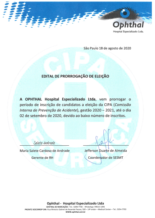 Informamos que a Ophthal funcionará normalmente no dia 07 de setembro – Feriado/dia da Independência do Brasil, portanto todos os colaboradores deverão trabalhar e receberão folga nos dias 24 e 31 de dezembro.